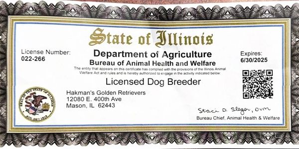 At Hakman’s Golden Retrievers, we take pride in being the only licensed breeder in Effingham County. We also have a grooming and boarding license. This certification ensures that we operate under state-approved guidelines, providing a safe, ethical, and professional environment for both our Golden Retriever puppies and boarding guests.